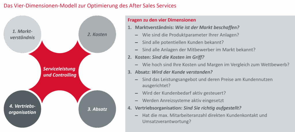 Oft wird der Service noch viel zu reaktiv betrieben. Nur die wenigsten Unternehmen kennen ihr Marktpotenzial im Servicegeschäft. Die Kosten der Leistungserbringung sind selten so unter Beobachtung wie im Neuproduktgeschäft. Vor allem aber wird der Kundenbedarf nicht in Gänze verstanden oder gar aktiv gesteuert. Eine Ausrichtung der Service-Vertriebsorganisation auf den Kunden mit Umsatzverantwortung aller Mitarbeiter fehlt.