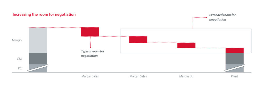 The purpose of competition is to reduce the cost base sustainably – through bilateral (customer – client, client – supplier) technical optimizations/avoided overspecification and through commercial negotiations. Commercially, it is important to use the typical bargaining power of the margins from sales, the business units and the supplier’s plants. Above-average price reductions, however, can only be achieved if credible genuine competition is created. This means that up to the point of awarding the contract, the suppliers must be left in uncertainty about the award decision, top performers must be questioned, and new suppliers must be requested. Competition thus places higher and new demands on the capacities and working methods of the organization: neutral inquiry specifications, standardized inquiries, early involvement of several suppliers per component, and awarding from a total cost-of-ownership point of view.