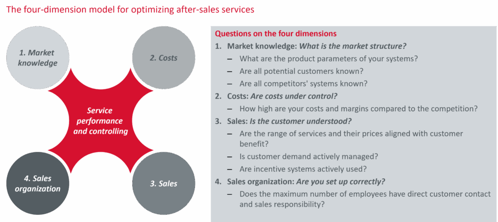 Often the service is operated too reactively. Only very few companies know their market potential in the service business, and the costs of service provision are rarely as closely watched as for the new product business. Above all, however, customer needs are not fully understood and actively addressed. There is no alignment of the service sales organization with revenue responsibility for all employees.