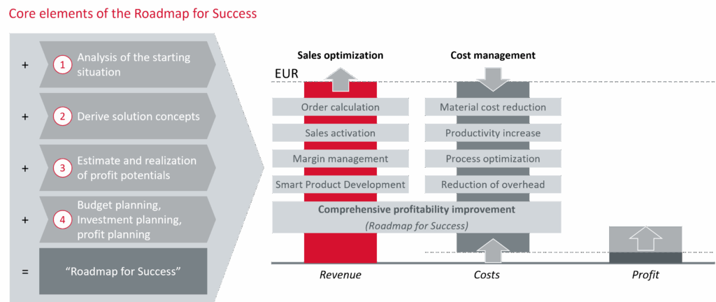 In the „Roadmap for Success“ our Fast Turnaround experts together with your specialists identify concrete action plans for all action areas. All individual steps are tailored specifically to the requirements of your company. Effective implementation, realistic quantification and chronological outcome are planned in detail and confirmed by controlling.