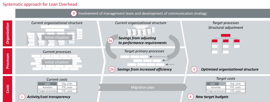 Effectiveness and/or efficiency improvement are the motivation for Lean Overhead, the streamlining of the organization. Decisive for success is the early buy-in of management and affected employees. As a leading management consultancy we optimize therefore not only your processes but also develop with you a transparent communication strategy.