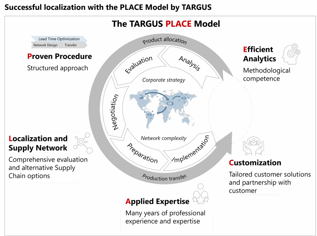 Therefore, parallel to the globalization of production, the trend towards reshoring, i.e., the formation of regional value creation networks, is also intensifying. With the PLACE model developed by TARGUS, we offer you a proven concept for optimizing your localization projects.