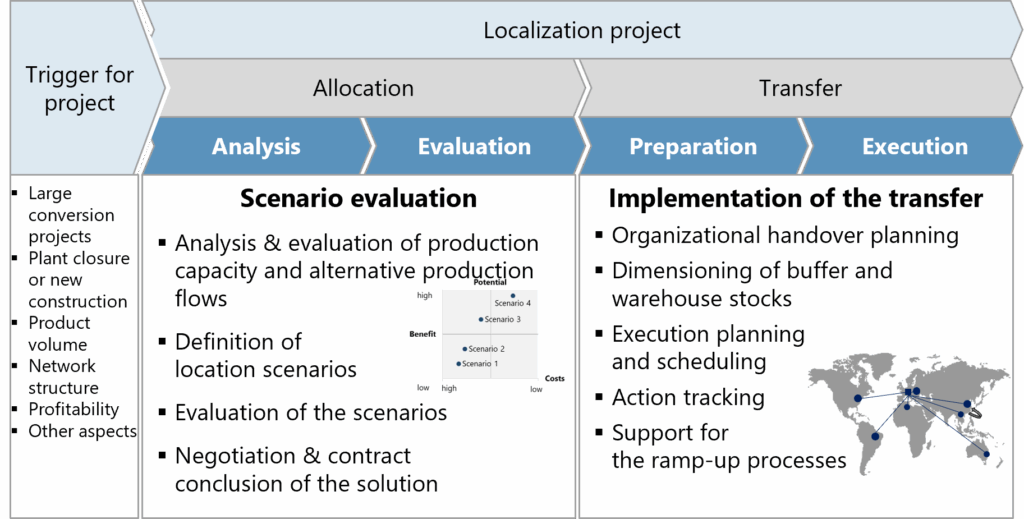 The efficient realignment of your products within the network through allocation as well as the relocation of production facilities or entire locations are in the focus of localization. It thus primarily comprises plant and product relocations, mergers, and relocations as well as outsourcing and insourcing of production.